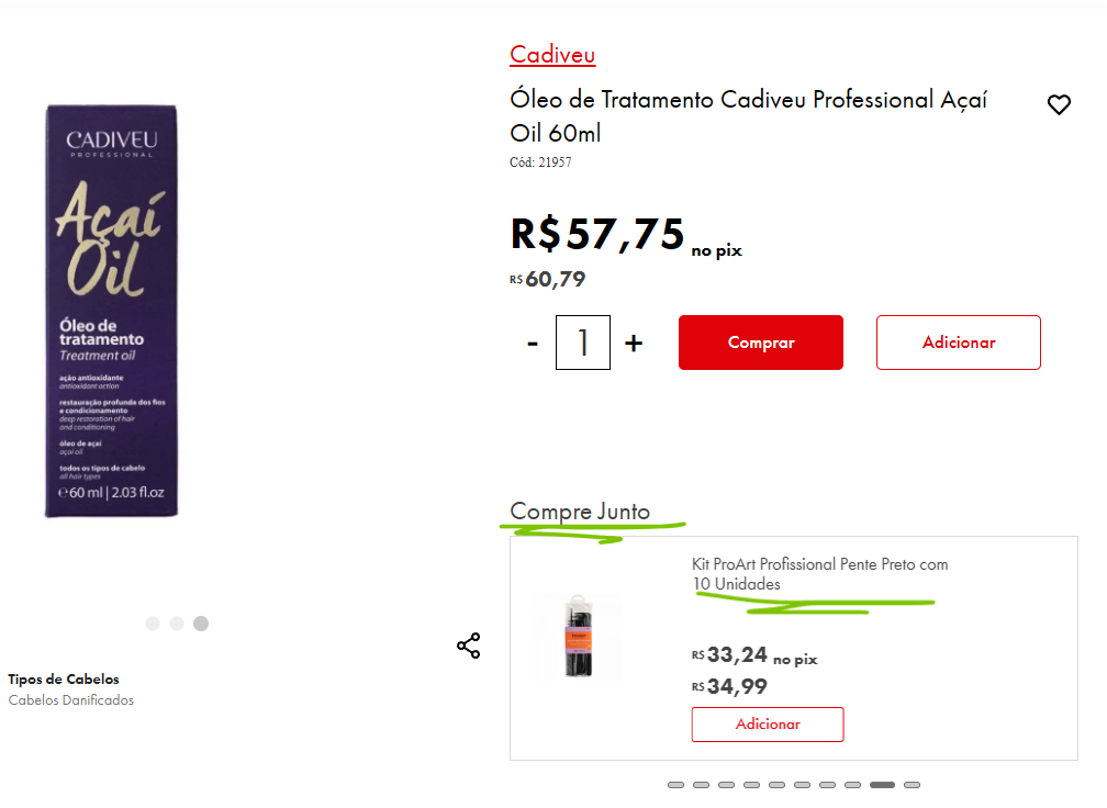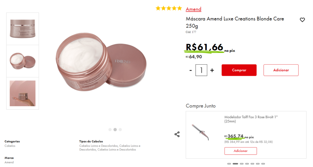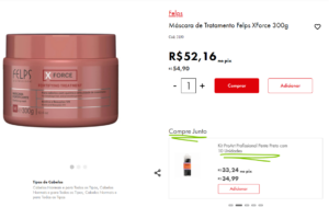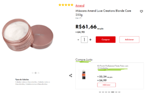 O cliente está navegando em uma máscara de cabelo de aproximadamente R$ 62. Quando verificamos as sugestões do Compre Junto, vemos um baby-liss de R$ 365.